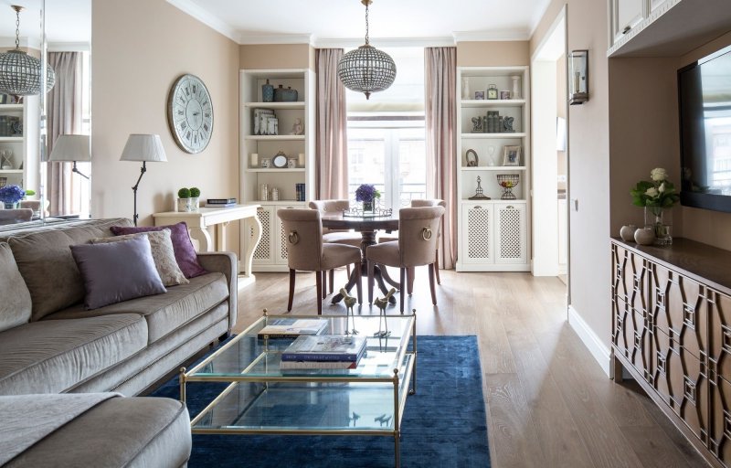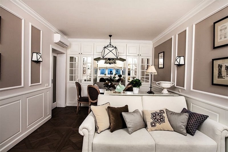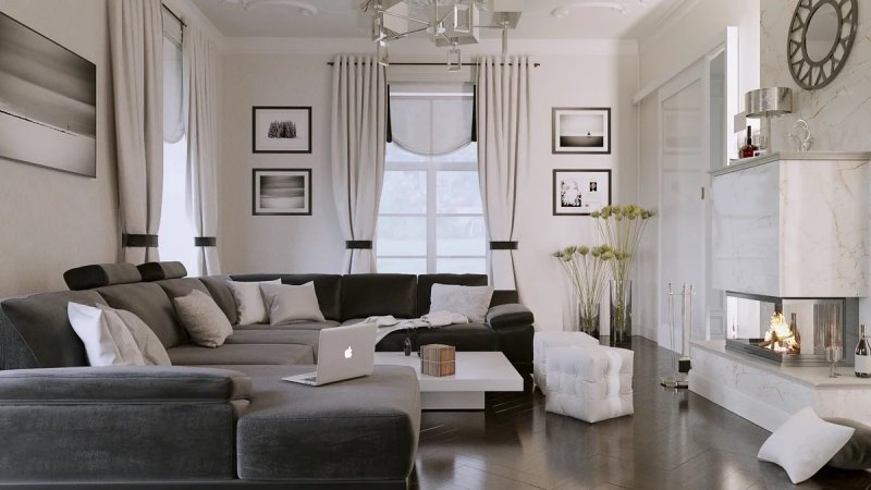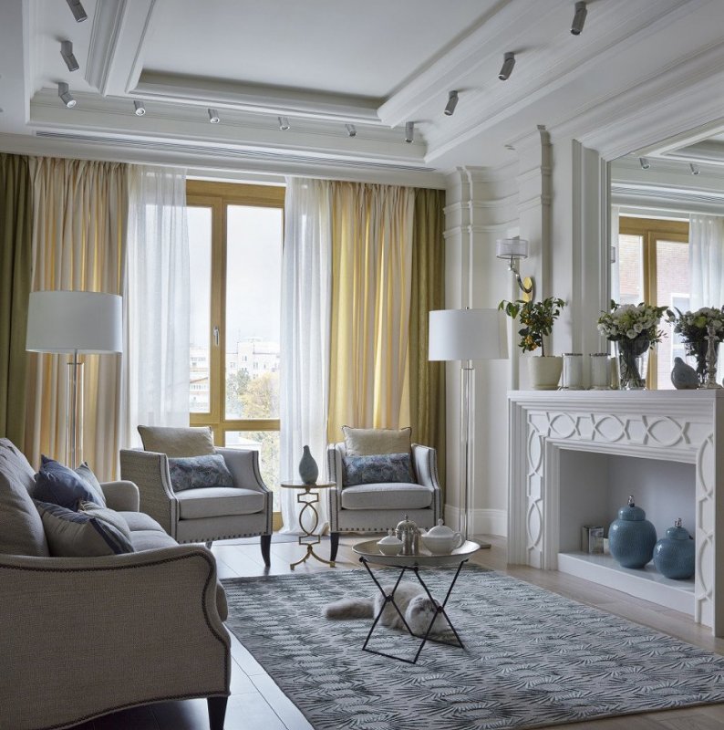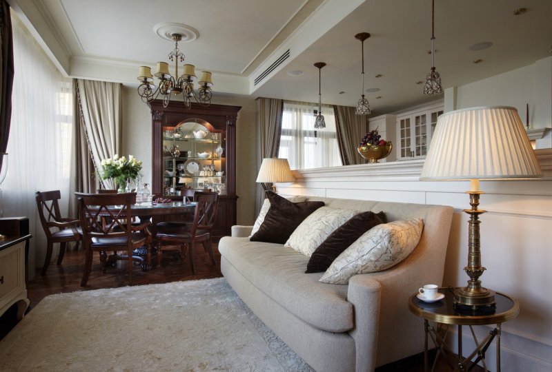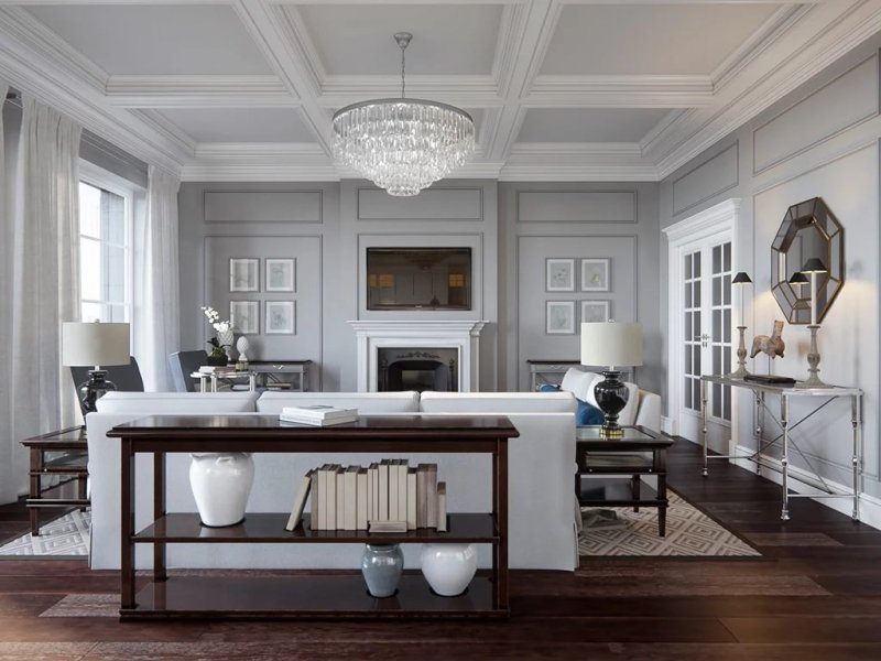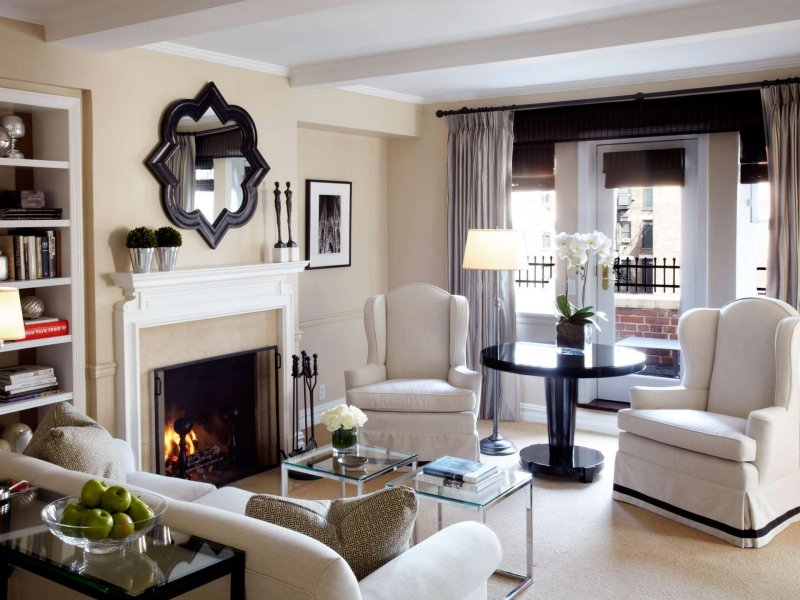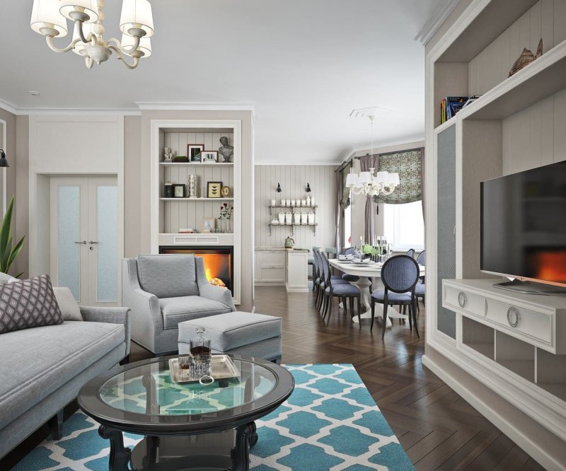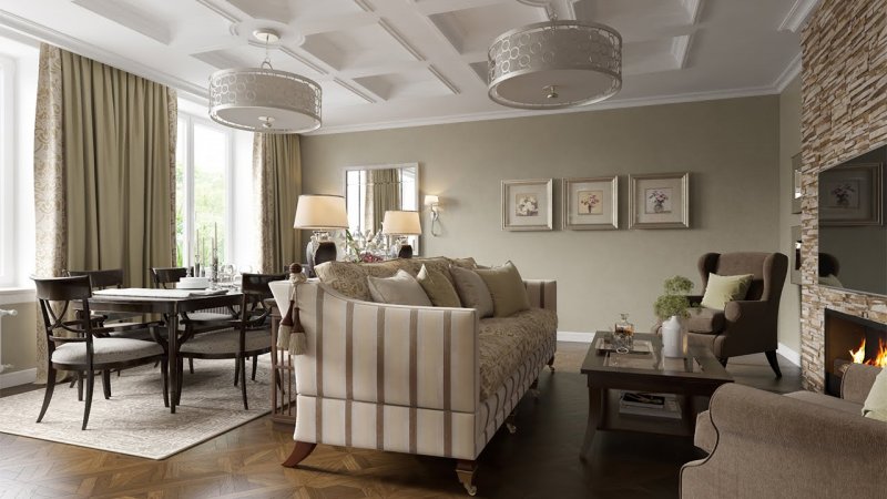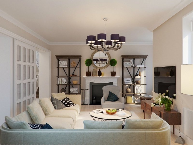 Главная черта подобных интерьеров – изысканная простота и элегантность, и известная гибкость. Здесь современная техника и инновационные стройматериалы отлично уживаются с классическими принципами формирования пространства. В дизайне вполне допустимо присутствие пластиковой отделки, текстильных изделий из смесовых материалов, имитации камина.