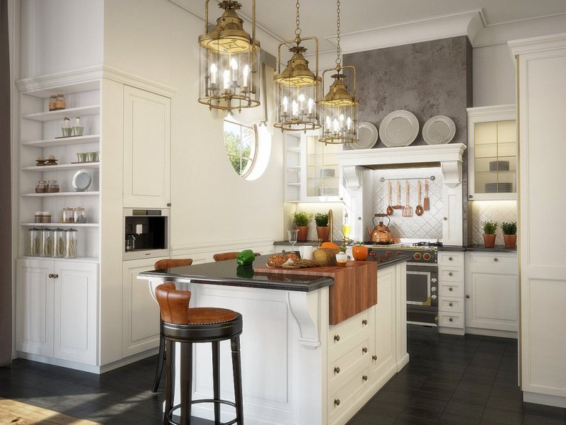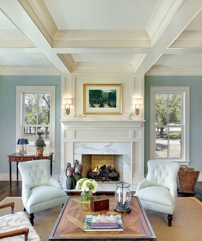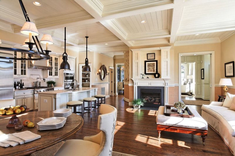 Потолок чаще всего невычурный, окрашивается в белый цвет. В других случаях изготавливают кессонную конструкцию из резного дерева, МДФ, пластика или гипсокартона, придающую помещению роскошный внешний вид. При создании интерьера в стиле кантри потолок декорируют массивными балками из натуральной древесины или их имитацией. Иногда потолочную поверхность или ее фрагменты оклеивают обоями.