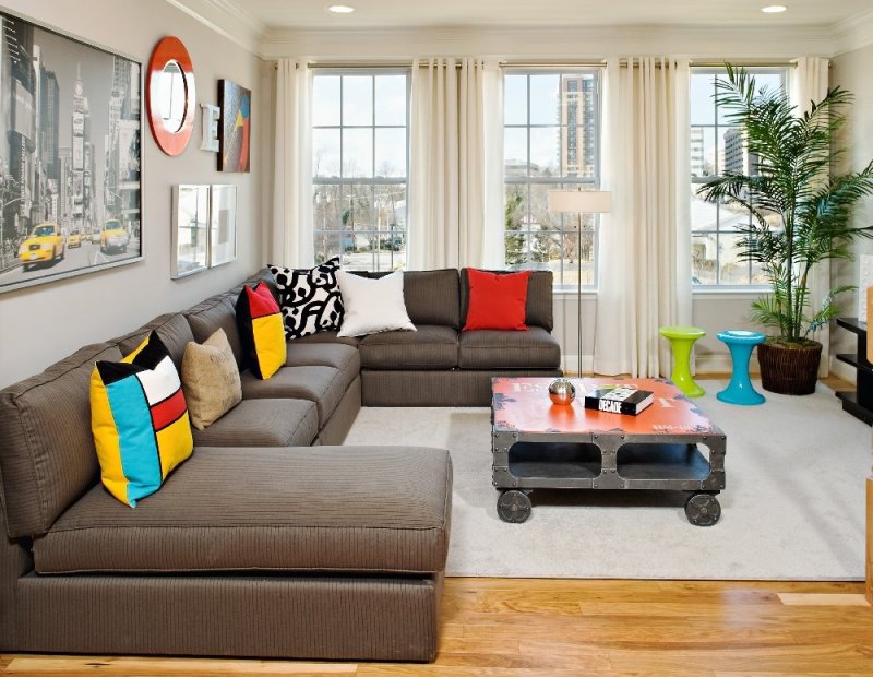Характерная особенность современного направления – сочетание функциональности и комфорта. Удобная мебель актуальных форм расставляется в соответствии с классическими принципами. Несмотря на преобладание современной мебели, в интерьере могут присутствовать элементы классики и ар-деко. Включение в обстановку классических деталей наряду с элементами хай-тек – очень часто используется при создании современных американских интерьеров. В убранстве классический камин может соседствовать с ультрасовременным телевизором, футуристические светильники с экзотическими вазами и статуэтками, зеркальная мозаика с каретной стяжкой.