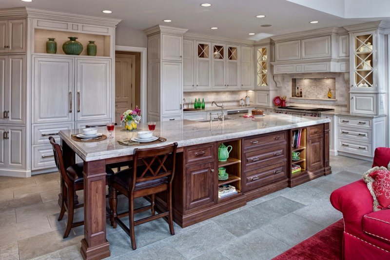 Мебельный гарнитур лучше выбирать из массива или с покрытием, имитирующим натуральную древесину. Матовые поверхности фасадов не должны иметь много декора. В американской кухне весьма популярным элементом является островной элемент гарнитура со встроенной варочной поверхностью, раковиной или дополнительной рабочей площадью. Барные стойки также приветствуются. Ими кухня может быть отделена от гостиной. Наиболее часто американцы выбирают П-образную модель гарнитура. Встроенная техника более предпочтительна. Еще один обязательный элемент – массивная купольная вытяжка.