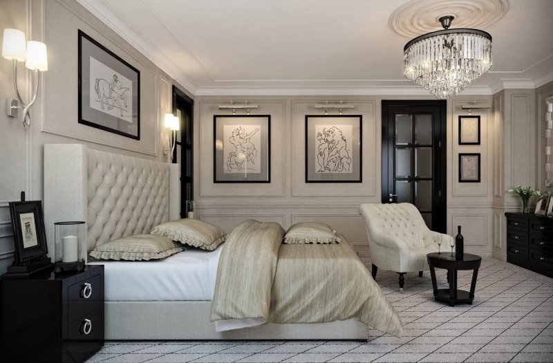 В спальне могут присутствовать синие и малиновые оттенки. Отлично подходит декор в цвете позолоты или металла. Эти цвета идеально сочетаются с базовой палитрой стиля. В интерьере также приветствуются контрастные сочетания: