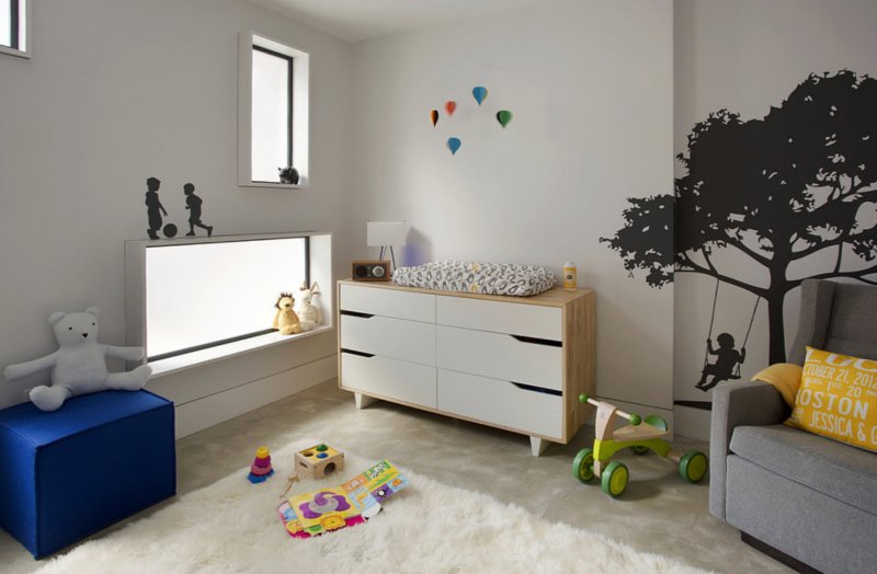 В минималистической детской следует хорошо продумать систему хранения игрушек и личных вещей. Уместными будут выдвижные тумбы на колесиках, мини-боксы и коробки. Емкости можно сделать различного размера с несколькими ячейками для размещения пазлов, конструктора, мягких игрушек, предметов для рисования, лепки и прочих мелочей.