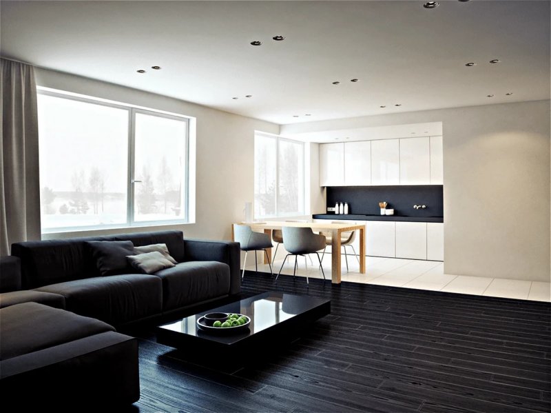 Даже самую маленькую квартиру в хрущевке можно сделать стильной студией в минималистическом стиле, особенно, если есть возможность убрать все внутренние перегородки. Разделение зон в этом случае проводят с помощью различных контрастирующих напольных материалов. Нужного эффекта можно добиться при использовании разного цвета и фактуры.