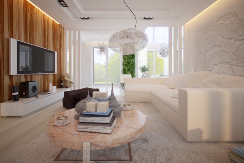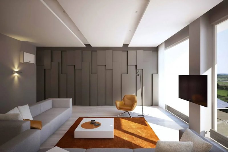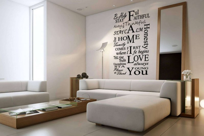 Минимализм будет отлично смотреться в зале любого размера. Вся мебель должна быть подобрана в определенном стиле и в полном соответствии вкусу хозяев. При наполнении гостиной различными предметами не обязательно использовать скучные и холодные тона. Добавить красок в важную комнату можно с помощью текстиля, ковров, объемного декора. Часто делают одну из стен акцентной, украшают ярким панно, стильными фото.