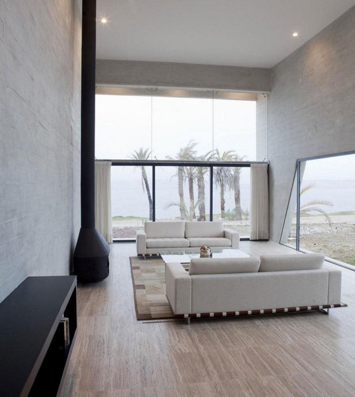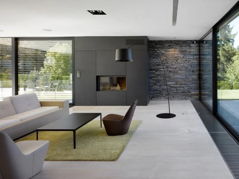 Для оформления стен используют простые однотонные материалы. Это могут быть панели со вставками из натурального дерева, стеклянная или керамическая плитка. Если это частный дом, то вместо одной из стен используют панорамные окна. Колонны и простенки отделывают камнем или мрамором. В лофт-минимализме хорошо смотрится кирпичная кладка или мозаика из натурального камня.