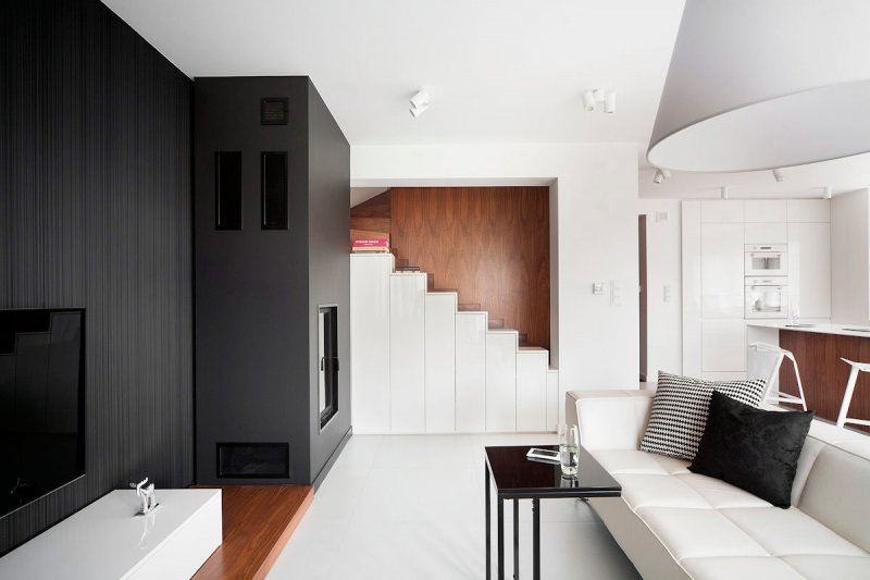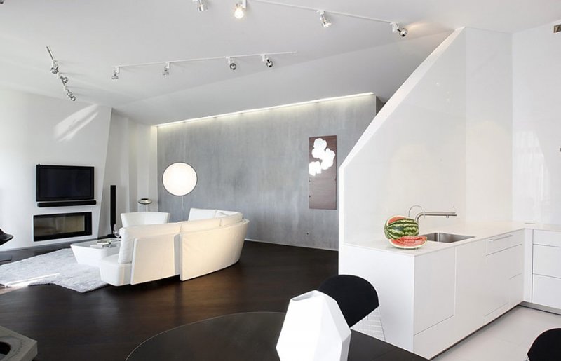Многие дизайнеры в минимализме играют на контрастах. Самое популярное сочетание – белого и черного. При желании чисто-белый можно заменить фактурой натуральных материалов (коричневым, стальным, серым). Потолки в минимализме делают однотонными, бежевыми, песочными, белыми. Натяжные конструкции могут быть глянцевыми, выкрашенные – матовыми.