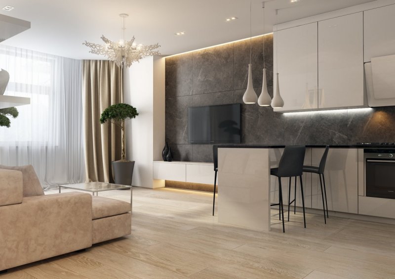 Пространство гостиной в однокомнатной квартире увеличивают всеми доступными способами. Можно убрать перегородки, объединить комнаты, использовать хитрости с освещением. Окна в минималистическом зале редко завешивают шторами. Для создания уюта в вечернее время можно использовать для проемов римские шторы. В качестве искусственного освещения применяют встроенные светильники в потолок и в мебель. Популярны шаровидные лампы и плафоны неправильной формы.