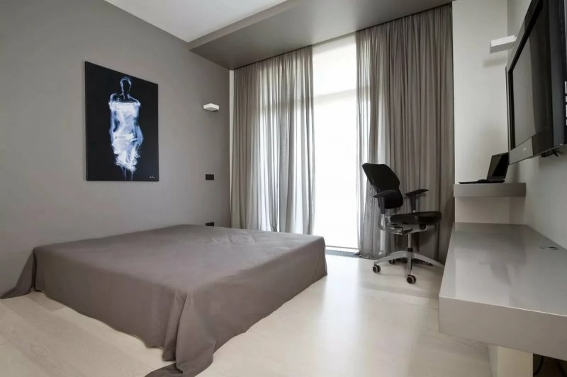 Элементы мебели в спальной комнате должны быть выполнены из стали, кожи, дерева и прочих природных материалов. Хорошо будет смотреться металлический стеллаж, стеклянный стол. Разбавить однотонность помогут яркие подушки или пуфики.