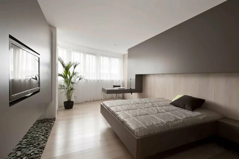 Центральное место в минималистической спальне занимает большая кровать. По бокам размещают прикроватные тумбочки, туалетный столик. С помощью цвета можно сделать комнату консервативной, элегантной, экстравагантной, сузить или расширить помещение. При выборе отделочных материалов следует уделять особое внимание их экологичности.