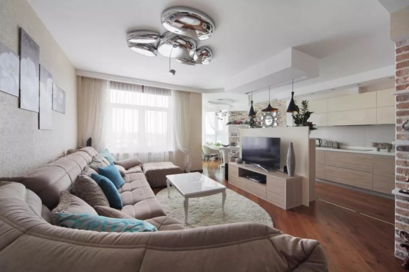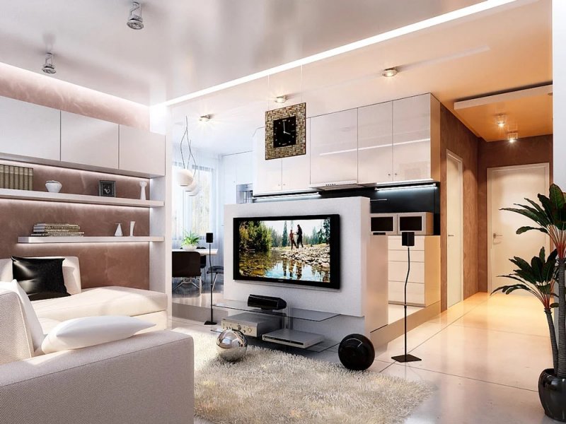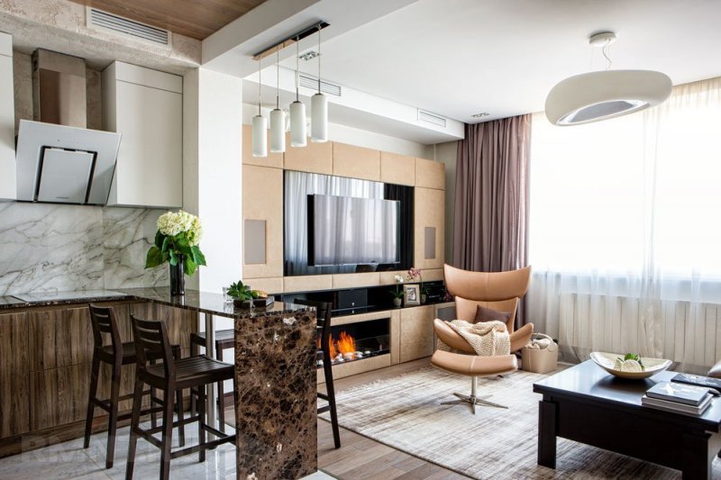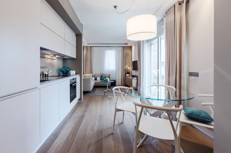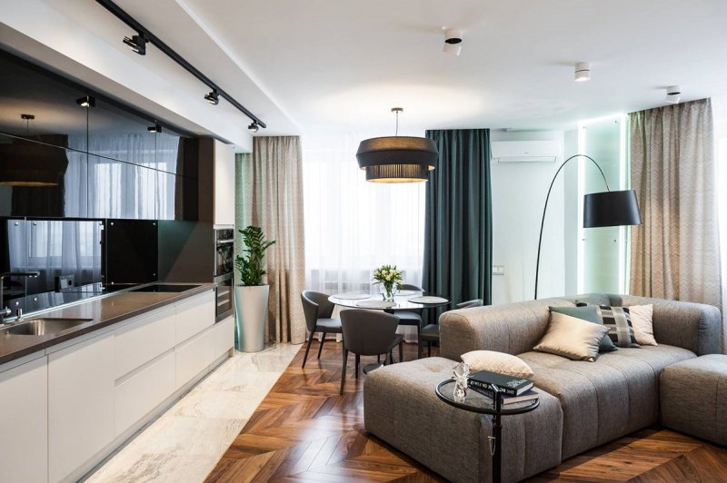 Кухонная зона совмещается с обеденной. В квартирах типа студия кухня является частью гостиной. Этот способ организации пространства позволяет сделать помещение более свободным. Зону кухни можно выделить при помощи света, подиума, отделки разными материалами.