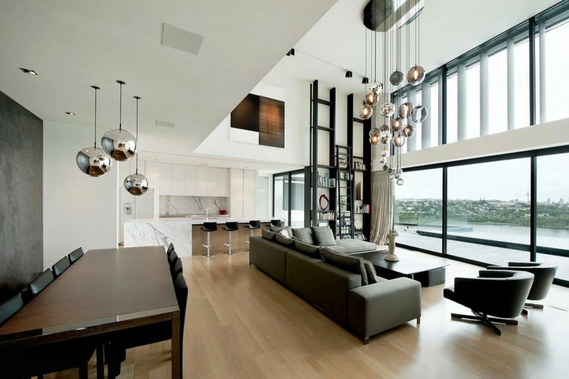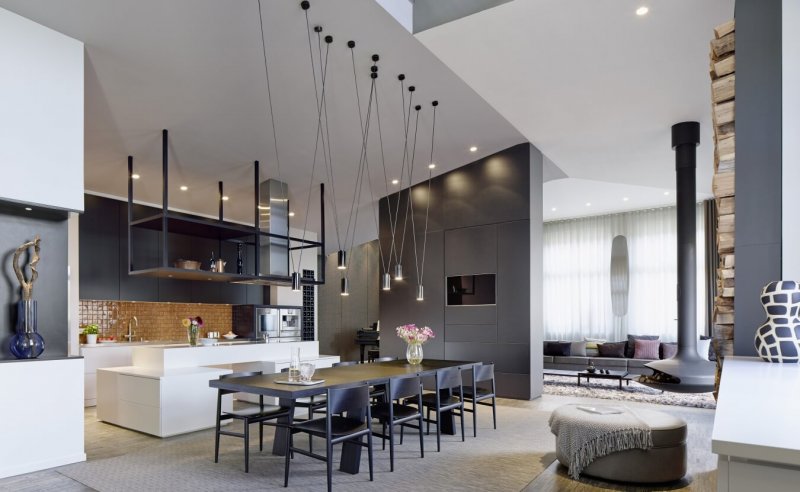 Применяется большое количество осветительных приборов. Дополнительно освещается рабочее пространство, обеденная зона, барная стойка.