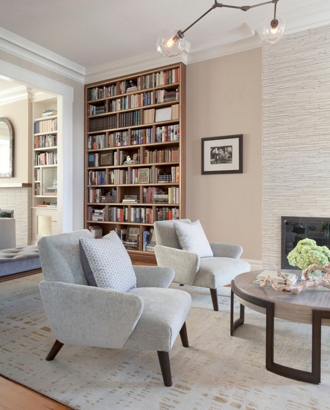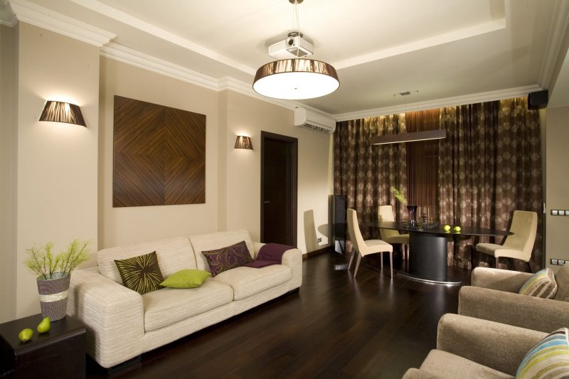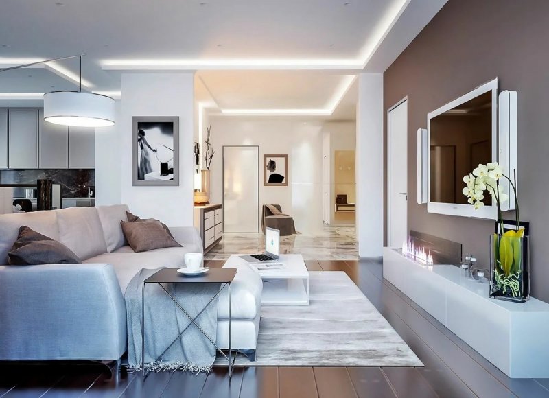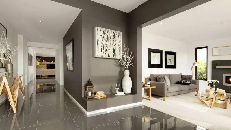 Современные интерьеры наполняют нейтральные расслабляющие цвета. Они не притягивают внимание и не вызывают раздражения. В современных жилищах мегаполиса популярно использовать серо-коричневую гамму в качестве фона к белым поверхностям. Акценты расставляются в интерьере с помощью декоративных элементов, мебели и домашних растений.