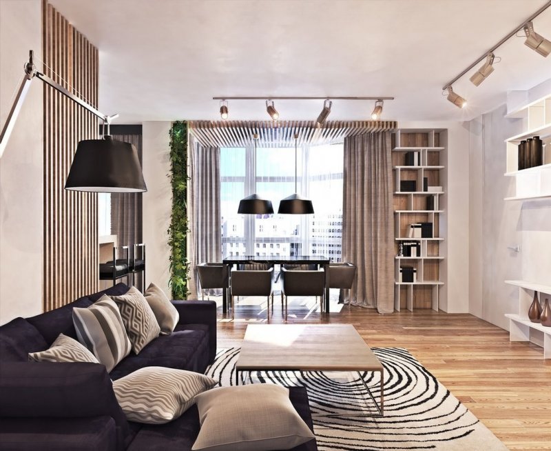 Монотонные сдержанные интерьеры с их нейтральной цветовой гаммой, ровными линиями и простыми формами так и хочется оживить. Вот здесь-то на помощь приходит текстиль с различными фактурами, яркими оттенками, узорами и орнаментами. Именно с помощью подушек, штор и покрывал можно добавить акцентных мазков, сделать комнату более выразительной. Главное, не переборщить. Используя этот прием, стоит ограничиться 1-2 цветовыми пятнами. Можно и вовсе отказаться от дополнительных цветов, но добавить узоров. Для данного стиля подойдут простые в уходе, натуральные ткани. Интересно смотрятся сочетания одноцветного текстиля с разными фактурами. Особенно привлекательны контрасты между мягкими пушистыми тканями и жесткими формами мебельных конструкций. Наиболее наглядно эффект этого приема можно увидеть в использовании ковра, который делает комнату более теплой в буквальном и в переносном смысле.