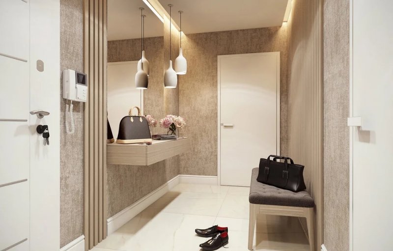 Прихожая контемпорари окрашивается в светлые оттенки. Стены могут быть отделаны клинкерным кирпичом или декоративным камнем. Пол выкладывается ламинатом, линолеумом, кафелем или виниловой плиткой. Помимо центрального освещения применяется точечная или светодиодная подсветка. Мебели не должно быть много. Вполне достаточно вместительного и многофункционального, встроенного шкафа-купе и небольшой скамейки с полочкой для обуви. Стены можно украсить парой картин.