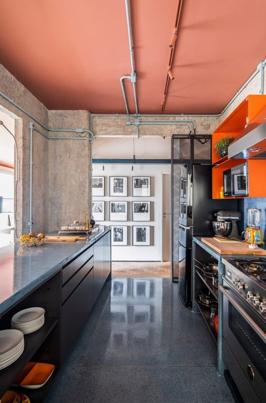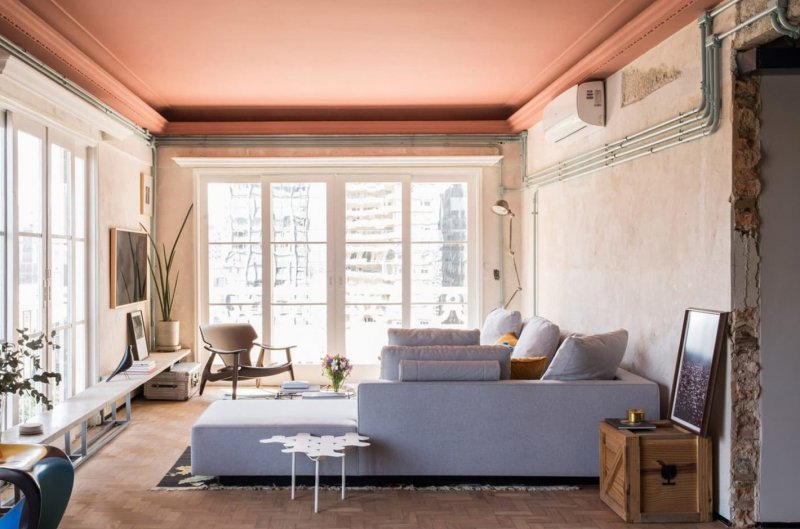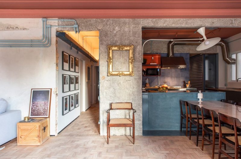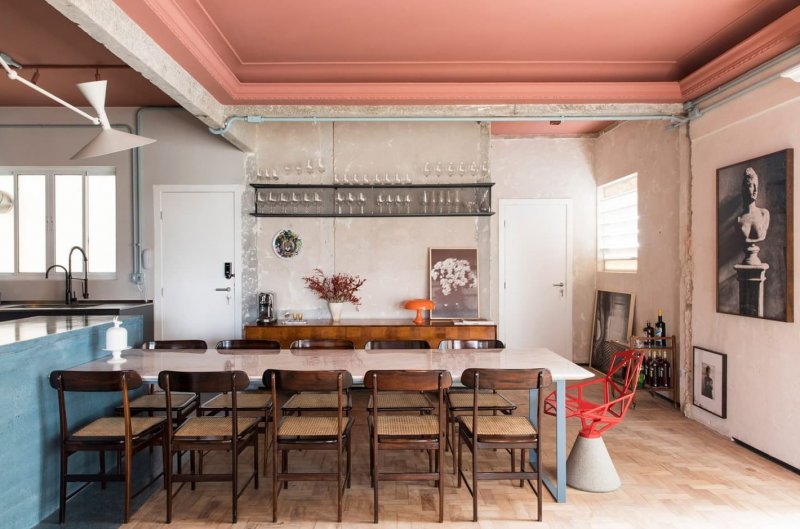 Бразильская студия SuperLimao оформила апартаменты, расположенные внутри модернистского здания Saint Honore, построенного в 1958 году Артахо Хурадо. Пара, которая планирует там жить, интересуется искусством, архитектурой и фотографией. По просьбе заказчиков, архитекторы разрушили стены коридора, чтобы создать большую гостиную и столовую открытой планировки для приема гостей. Но при этом многие из существующих исторических элементов интерьера были сохранены. Локация: Сан-Паулу, Бразилия Площадь: 492 кв.м. Архитектура и дизайн: SuperLimao В главной жилой зоне дизайнеры зачистили задние поверхности, обнажая трубы, большие куски кирпича и штукатурки. В палитре преобладают бледные сине-зеленые оттенки, которые присутствовали в интерьере здания изначально. Пастельные тона контрастируют с обожженным розовым потолком и синей бетонной столешницей. Стеклянные двери и ряд высоких окон обильно снабжают помещение естественным светом. Дизайнеры выбрали эклектичное сочетание мебели из разных материалов: металлические стеллажи, мраморный стол, деревянные стулья, современные консоли, гаражная дверь. Мы разбираем интерьеры - подробно! Чтобы вы могли лучше понимать, на чем строится хороший интерьер, чтобы учились у лучших. Подготовка такого материала требует времени, а интерьеров много. Помогите нам выбрать самые достойные - проголосуйте ЗА интерьер, если вам хочется увидеть его в расширенной публикации и узнать детали создания.