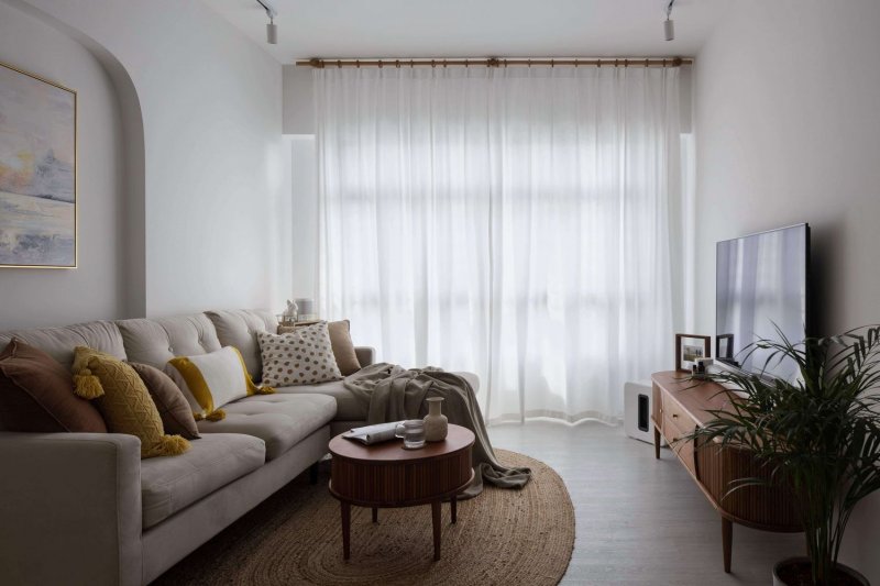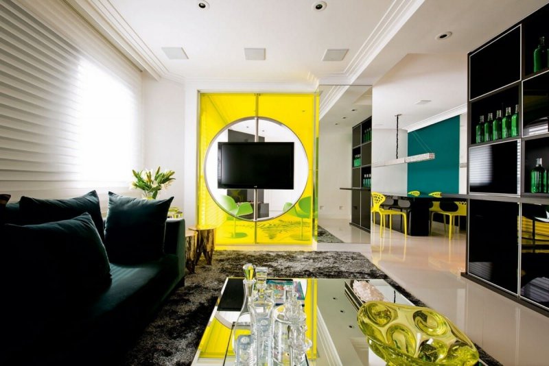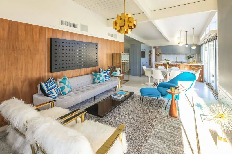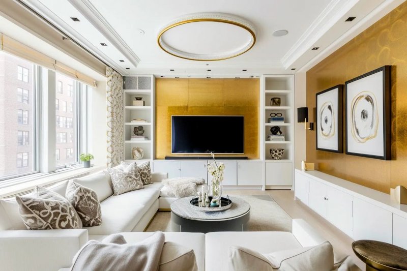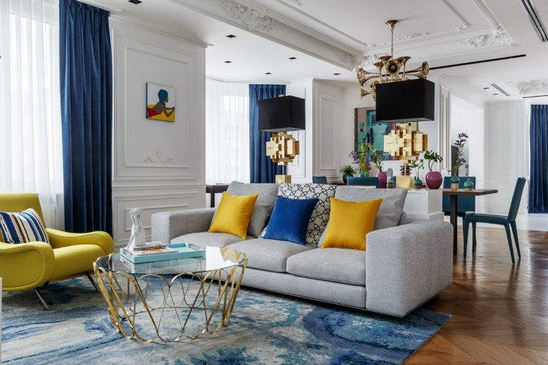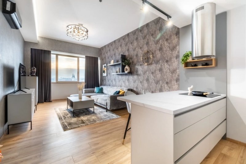 Гостиная объединяется с другими зонами квартиры: кухней, рабочим пространством или даже спальней.