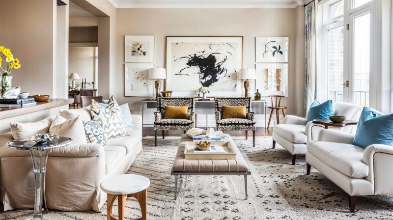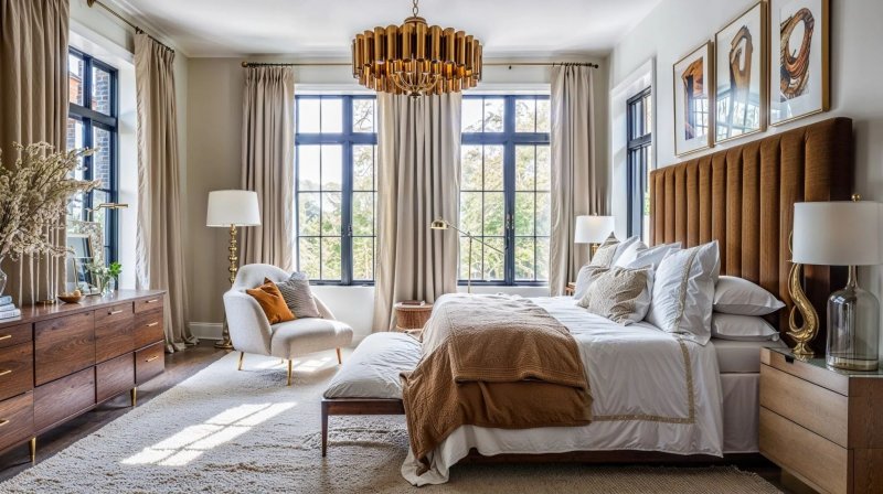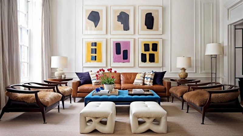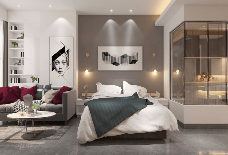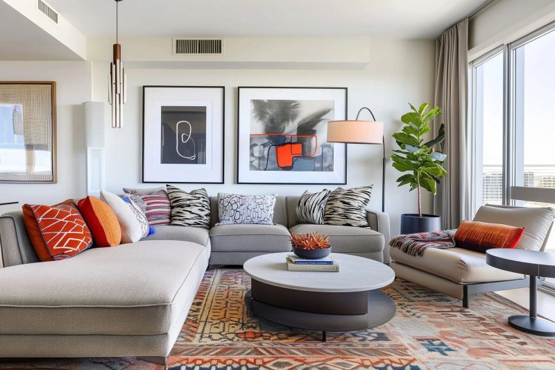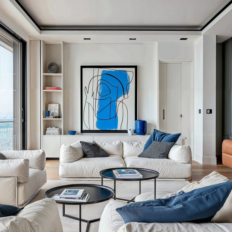Акцент делается на деталях с необычными формами. Геометрические объекты, абстрактные картины, зеркала сложных конфигураций – все это добавляет динамики и современности интерьеру. При этом общий подход остается сдержанным, чтобы декор не перегружал пространство.