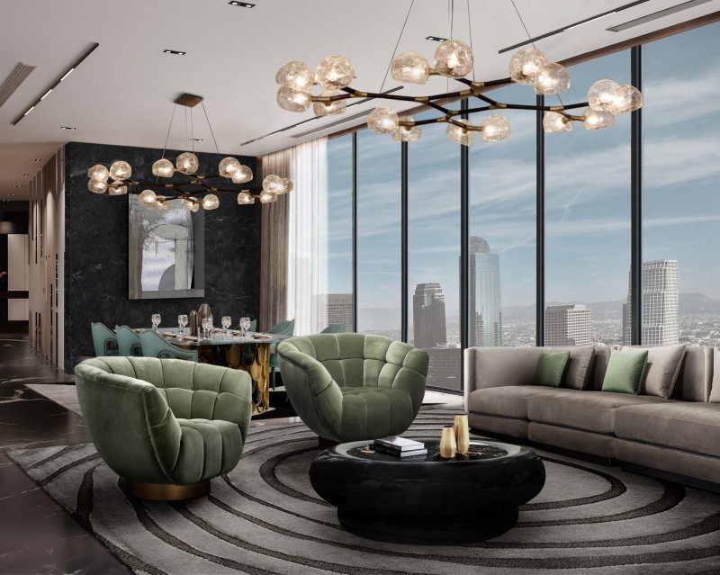 В тренде также акцентное освещение. Люстры в скульптурных формах, подсветка мебели и ниш, декоративные настенные светильники подчеркивают стиль интерьера.
