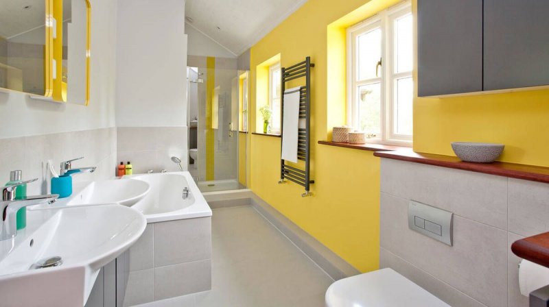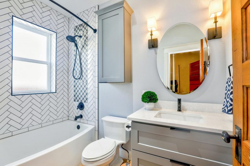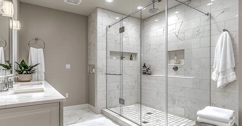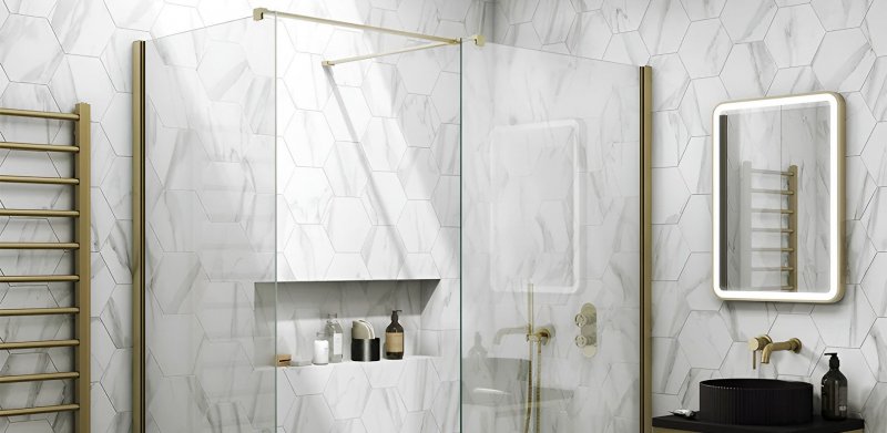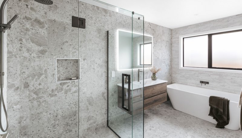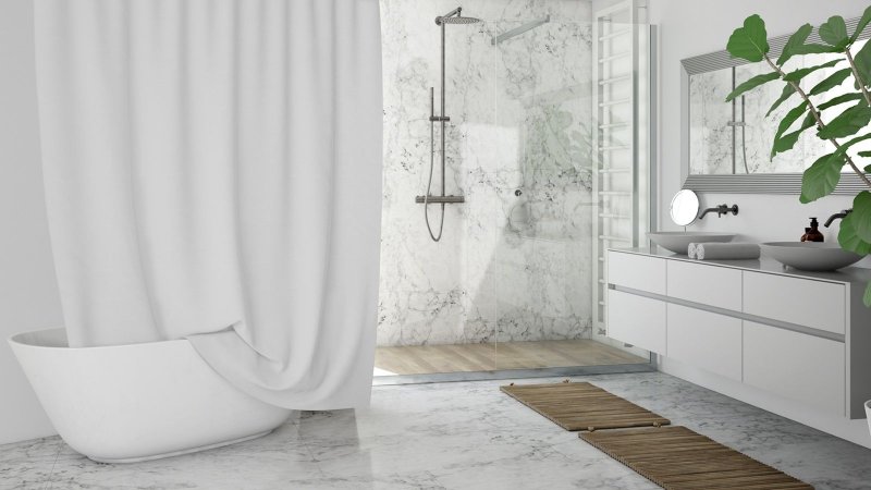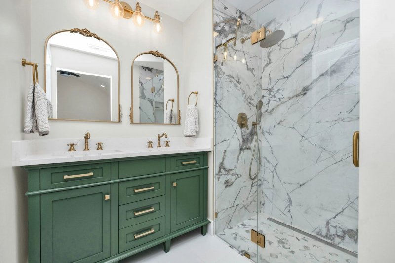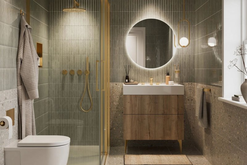 Дизайн сантехники ориентирован на минимализм: чистые линии, встроенные смесители и лаконичные формы создают визуальную легкость. В тренде матовые оттенки – черный, графитовый и латунь. Завершающий штрих – серо-зеленые акценты в сочетании с мягким освещением.
