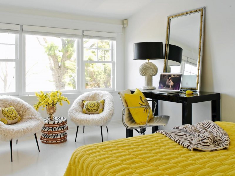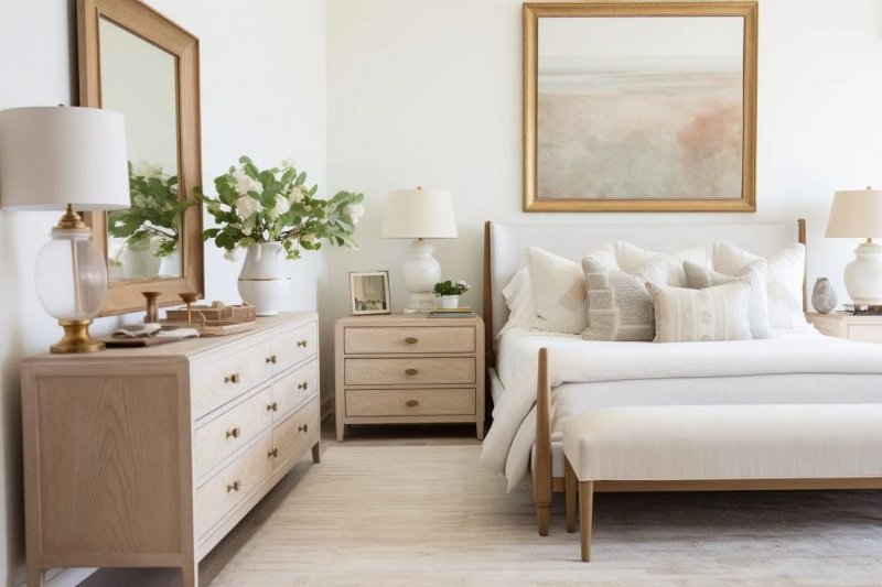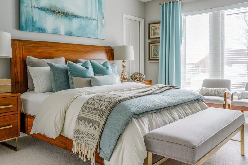 Дополнения в виде зеленого, золотистого или пастельных оттенков добавляют уюта.