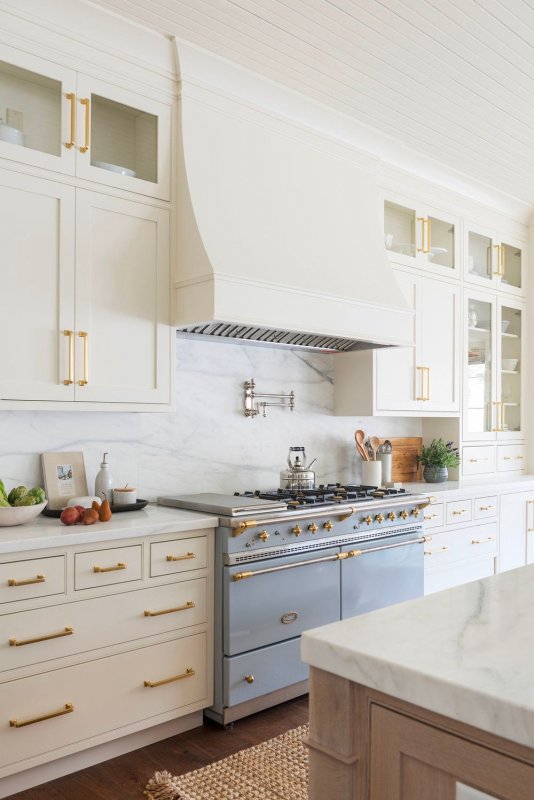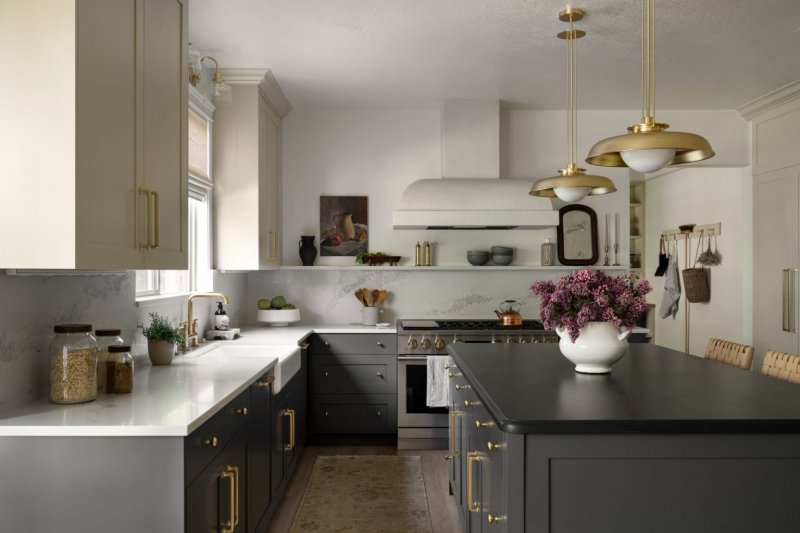 Используются гладкие фасады шкафов без ручек, встроенная техника и лаконичные линии. Чтобы избежать «стерильного» эффекта, добавляют теплые материалы: древесину, натуральный камень, латунь.