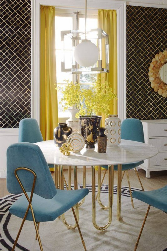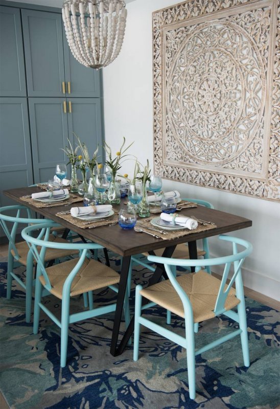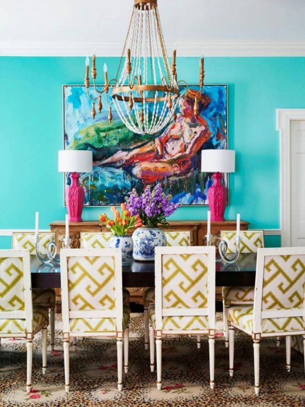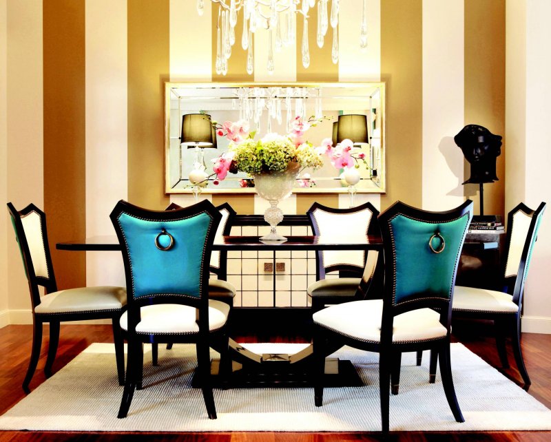 Этот цвет придает помещению свежесть. Тон приятный для глаз и легкий для восприятия. Дизайнеры рекомендуют с помощью бирюзового цвета выделять в столовой желаемые акценты (например, шторы, мягкий уголок, стулья, одну из стен).