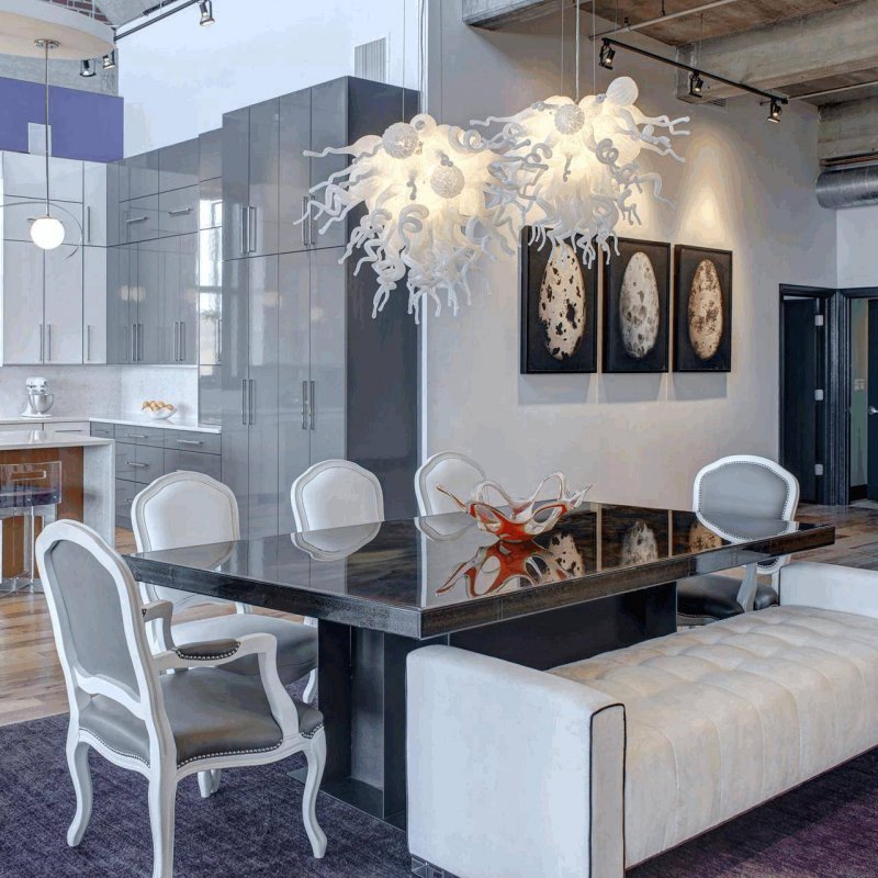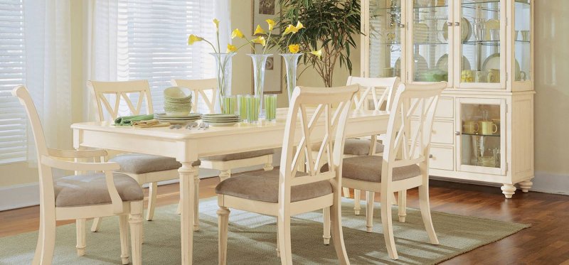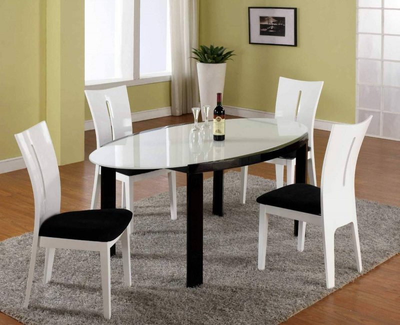 Столовая в белом цвете будет выглядеть изящной и воздушной. Белый хорошо сочетается со всеми тонам и задает контраст. Наиболее популярные комбинации с черным, красным и синим тоном. В качестве цвета потолков в столовой чаще всего выбирают именно белый.