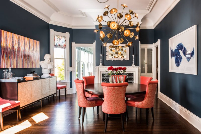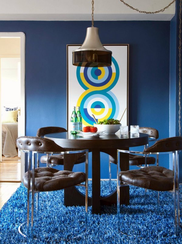 Благородный и глубокий синий цвет выгодно преобразит любую столовую, сделав ее выразительной. Столовая в синем цвете дополняет морскую тематику в интерьере. Синий желательно делать доминирующим в больших по площади столовых, чтобы он не скрадывал пространство. Основные сочетания – с желтым, коричневым, зеленым и белым.
