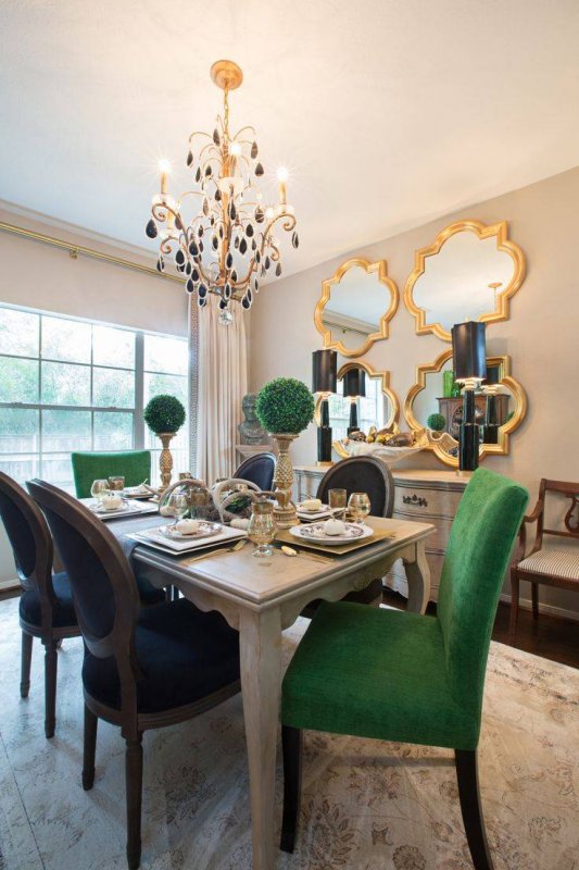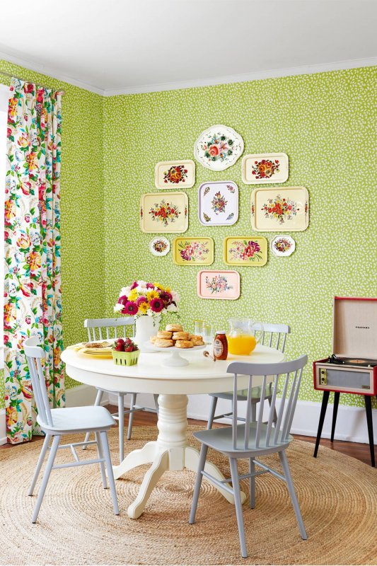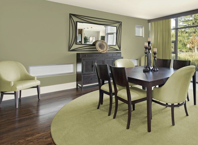 Зеленый цвет в столовой считается одним из самых выигрышных и популярных. Он олицетворяет природу и спокойствие. В такой столовой всегда приятно будет проводить время. Зеленый удачно сочетается с фиолетовым, белым, коричневым, золотистым.