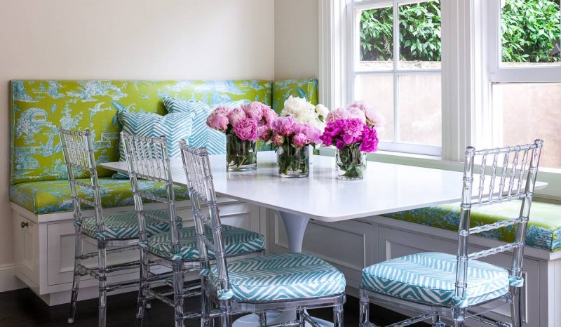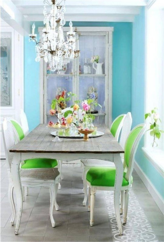 Это ненавязчивый цвет в интерьере столовой. Он подойдет для помещений с морской или средиземноморской тематикой (как синий и голубой цвет). Напоминая лазурную гладь моря, он успокаивает и улучшает настроение. Гармонирует тон в интерьере с синим, голубым, белым, оливковым.