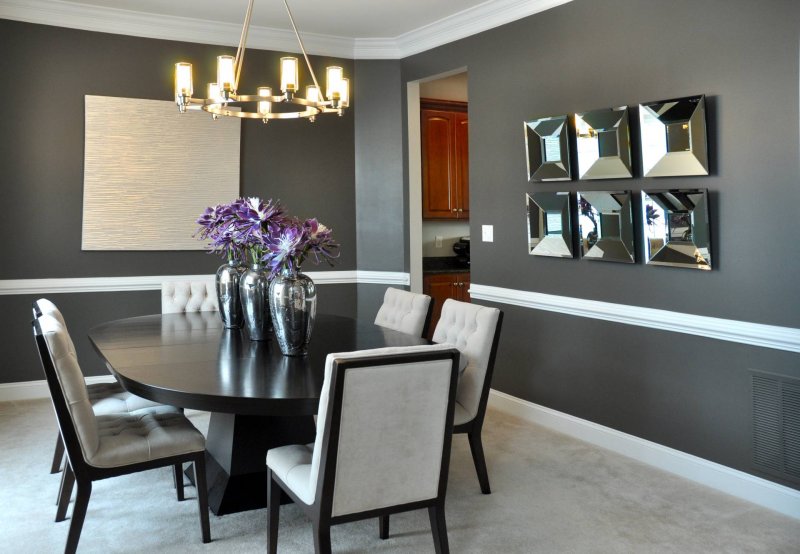 Чтобы столовая серого цвета не казалось скучной, не делайте классический серый тон главным. Такое решение на любителя. Серый впишется в практически любую обстановку. Эффектно дополнит дизайн столовой в сером цвете розовый, голубой и фиолетовый. Довольно интересное дизайнерское решение – серая столовая (на манер черно-белой фотографии) и один или несколько ярких предметов, например, розового цвета.