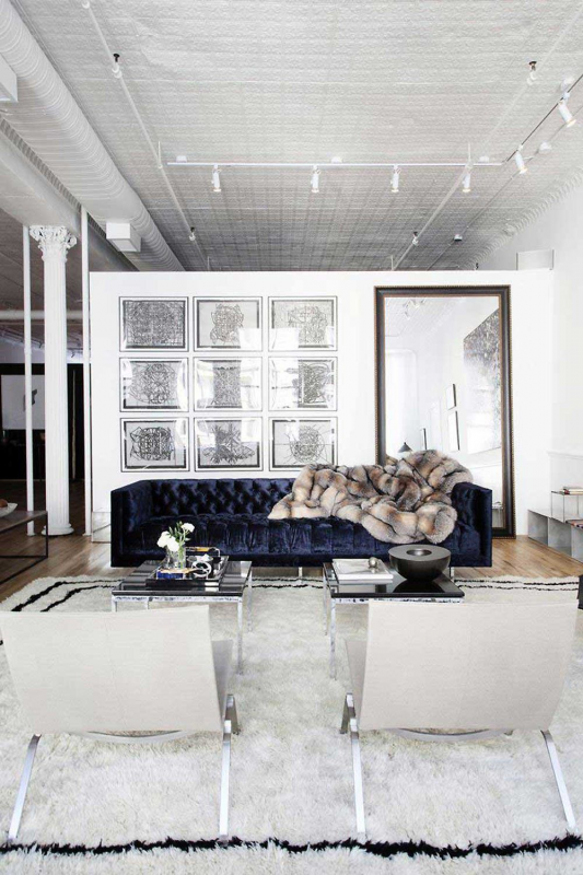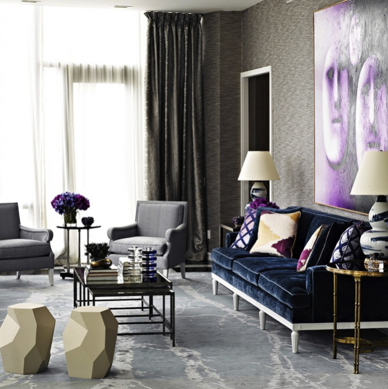 По центру гостиной должен лежать ковер с крупным, роскошным рисунком или однотонный. В этом случае все остальные предметы интерьера следует размещать по его периметру. Один из главных элементов — мягкий диван. От угловых моделей стоит отказаться, отдав предпочтение большому дивану с однотонной обивкой, крупными подушками.