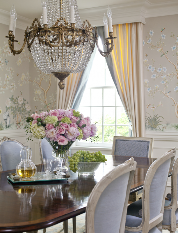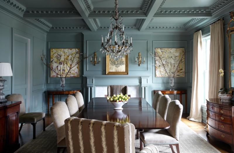 Обеденная группа из массива древесины с мягкой обивкой стульев будет дополнена хрустальной люстрой, висящей по центру.