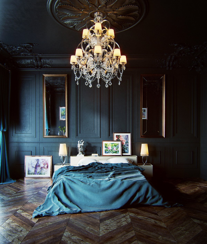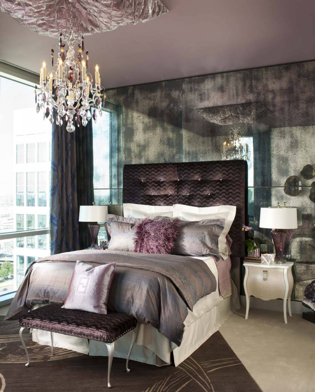Светильники лучше выбирать с обилием стеклянных подвесок. Прикроватные лампы могут быть с однотонными текстильными абажурами, хорошо рассеивающими свет.