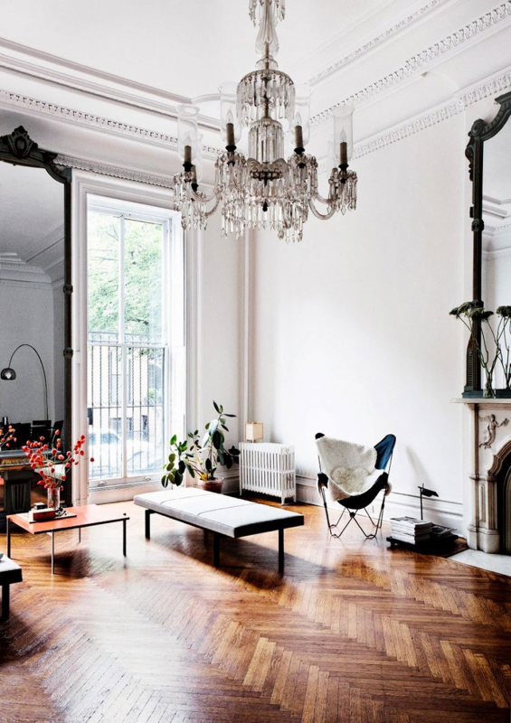 Совет! Деревянный пол смотрится роскошно и респектабельно, а в неоклассике он обязан быть совершенным, поэтому используйте ценные породы дерева или их имитацию, например, дуб, махагони, палисандр.