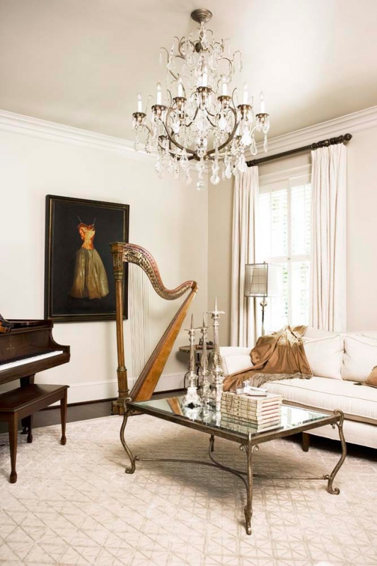 В качестве дополнительного света можно установить несколько встроенных светильников, торшеры, а также расположенных на разных уровнях бра, выполненных в том же стиле, что люстра.