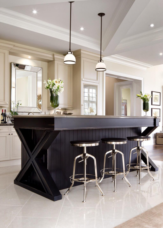 Для пола идеально подойдет полированный мрамор или керамогранит, эффектно будет смотреться контрастная (шахматная) отделка. Материал пола может повторяться на столешнице, немного отличаясь по оттенку.