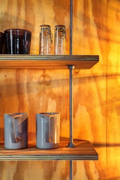После переезда в домики, владельцы обнаружили, что им нужно больше места для хранения на кухне кружек и стаканов. Гарсия придумал этот оригинальный стеллаж из фанеры с резьбовыми стержнями и гайками, который имитирует стиль, используемый на консольной части крыши. «Я хотел, чтобы эта деталь интерьера перекликалась с элементом экстерьера», — говорит он.