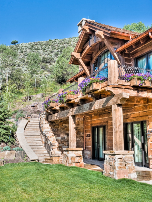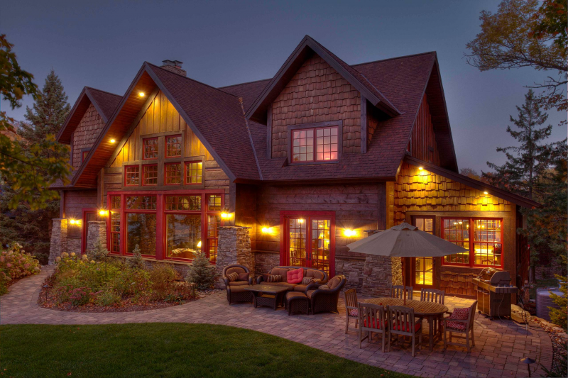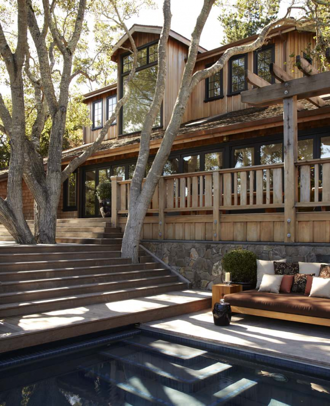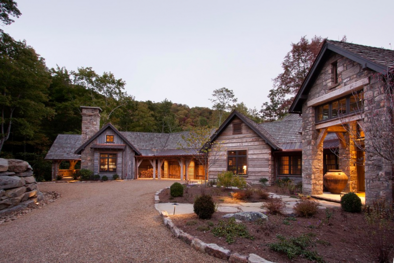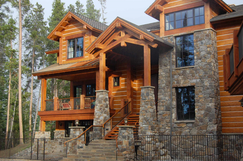 Стильное черно-коричневое оформление брусчатого дома с мансардой