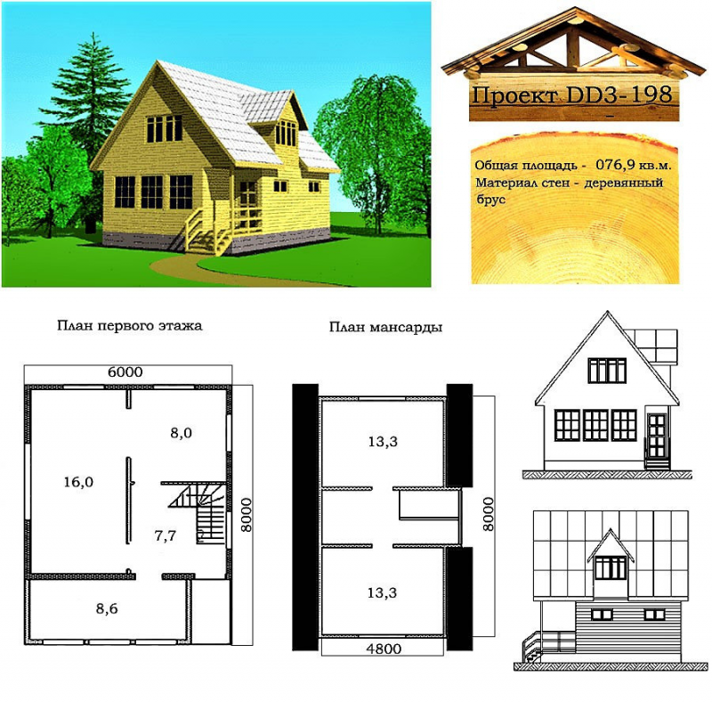 Проекты домов из бруса с мансардой обеспечивают будущих хозяев дополнительным помещением, которое может быть жилым или нежилым. Если кровельный пирог многослоен, в мансарде вполне можно проживать и в зимний период.