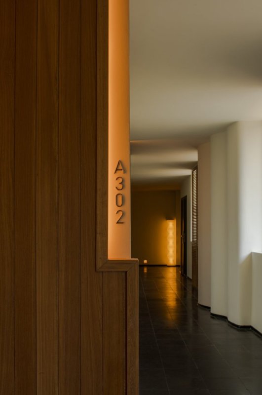 Коридор с номером A302 и теплой подсветкой в конце ALAN RESORT