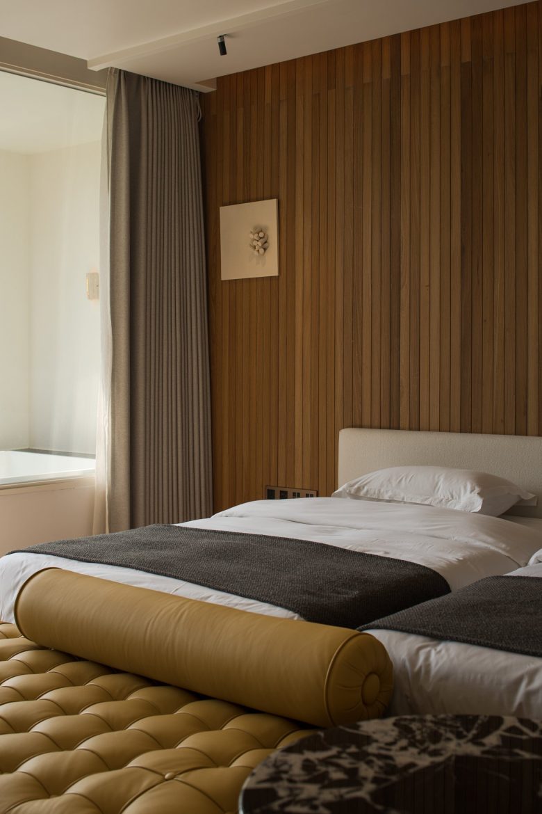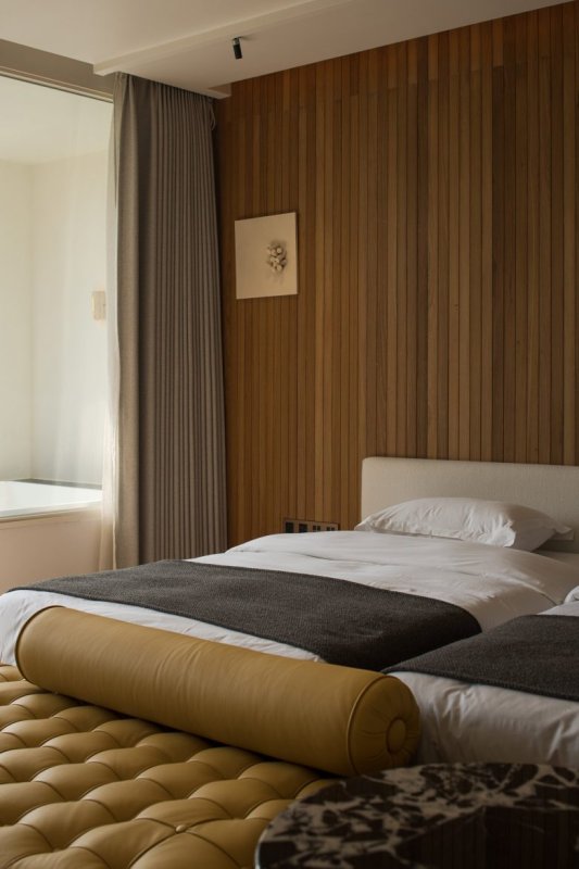 Кровать у деревянной реечной стены с мягкой банкеткой в изножье ALAN RESORT