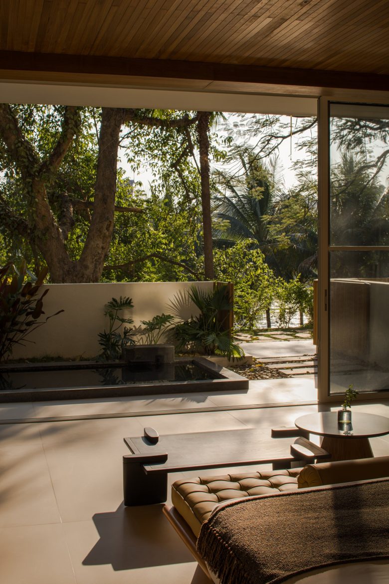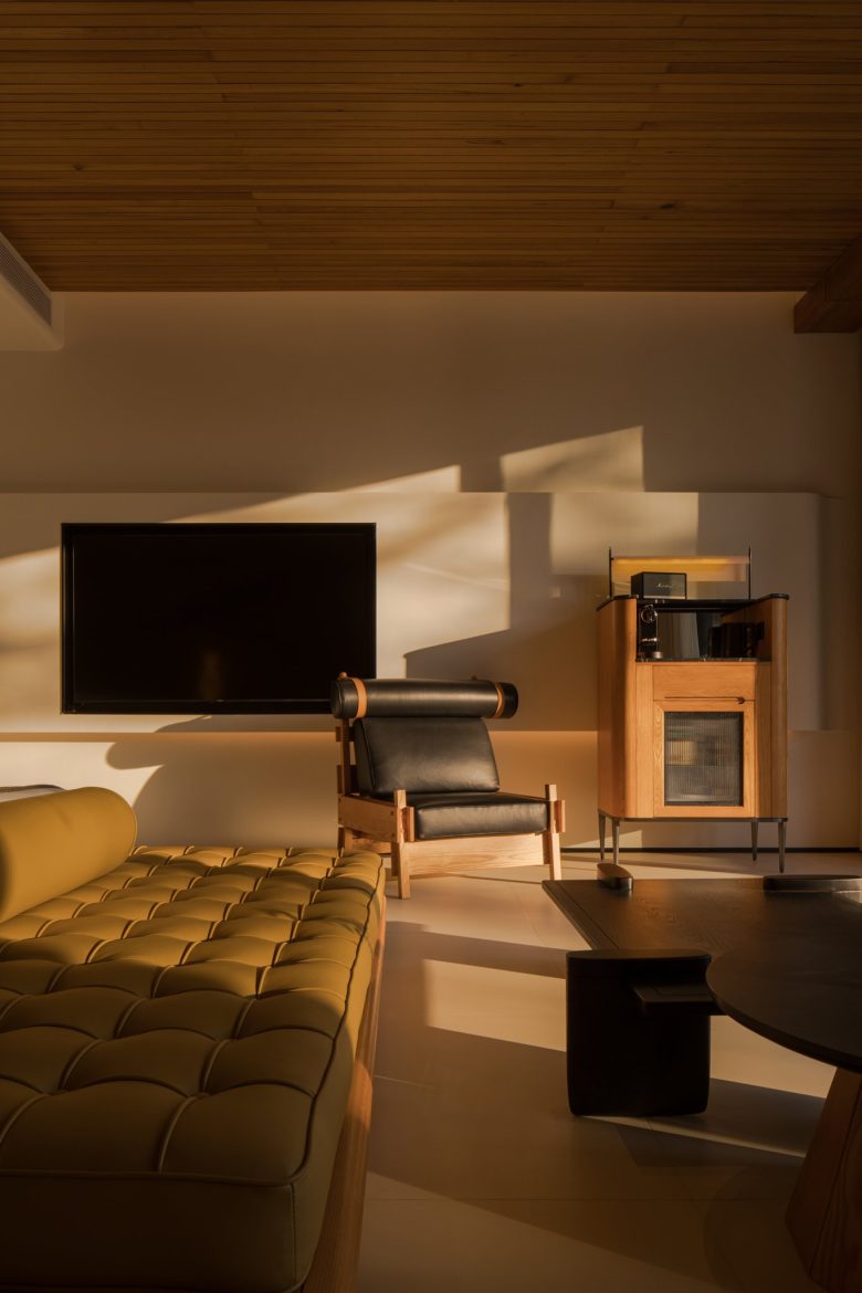 Внутреннее убранство подчёркивает единение с ландшафтом: в отделке использованы состаренное дерево, натуральные фактуры и минималистичная эстетика, настраивающая на созерцание и покой.
