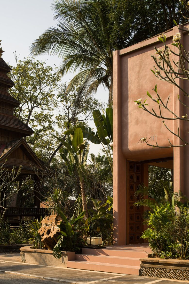 Главный вход ALAN с розовой штукатуркой, деревянной дверью и тропическими растениями ALAN RESORT