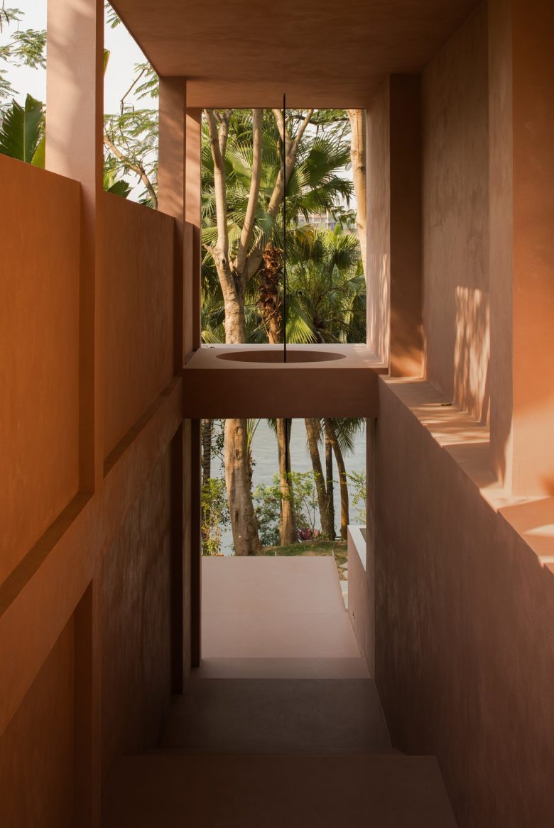 Лестничный пролет с терракотовыми стенами и квадратным проемом с видом на пальмы ALAN RESORT