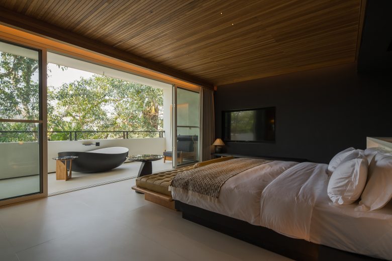Спальня с выходом на балкон и уличной ванной на террасе ALAN RESORT