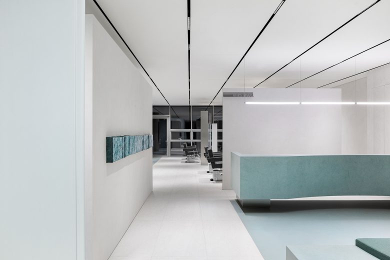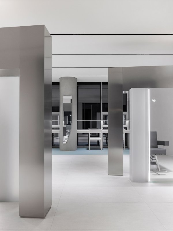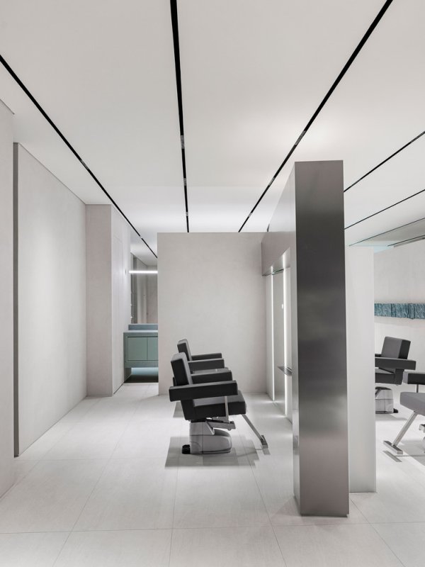 Внутренний план — открытый, но при этом каждая часть салона имеет свою отдельную функцию: консультационная зона, зона ожидания, рабочие места для стайлинга, зоны для мытья волос и отдыха — всё выстроено логично и понятно для посетителей.