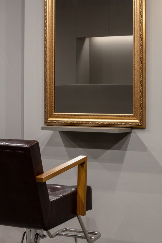 Стулья, зеркала и другие предметы мебели были выбраны с учётом пожеланий владельца салона. Это подчёркивает, что доминирующая идея — не навязывание дизайнерской «величия», а уважение к индивидуальности и назначению пространства.