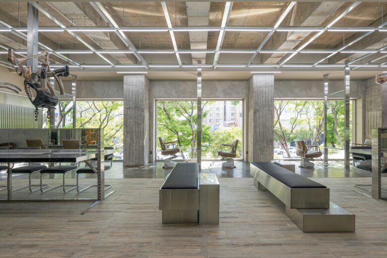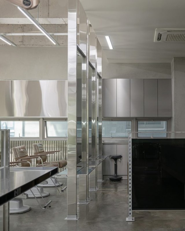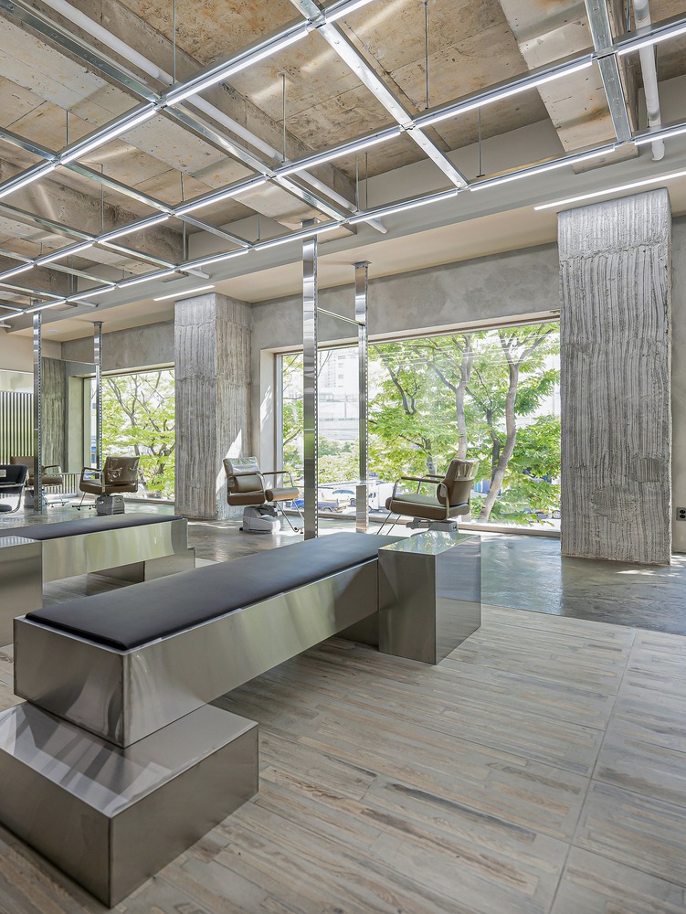 Салон красоты Chaoreum Hair, расположенный в южнокорейском городе Пусан, был разработан архитектурной студией HAhi Studio как современное пространство, ориентированное на индивидуальные ощущения клиентов и новый формат обслуживания. Общий вид пространства салона с сетчатым потолком Chaoreum Hair Salon Проект стремится выйти за рамки традиционного дизайна парикмахерских, предлагая интерьер, который формирует особую атмосферу и усиливает впечатление от посещения салона. Вдохновением для концепции послужило окружение района Чонпо-дон — места, где соседствуют магазины строительных материалов и современные коммерческие пространства. Архитекторы решили отразить этот контраст в интерьере, сочетая индустриальные элементы с более мягкими дизайнерскими решениями. Такой подход позволил создать пространство, которое одновременно выглядит современным, динамичным и связанным с городской средой. Зона ожидания и рабочие места у окон Chaoreum Hair Salon В оформлении салона используются разнообразные материалы, включая металл, винтажные покрытия пола и стен, а также современные декоративные плитки. Несмотря на индустриальную основу, интерьер сохраняет визуальный баланс благодаря спокойной цветовой палитре из серых оттенков и цвета слоновой кости. Это помогает сформировать гармоничное пространство, которое остаётся комфортным для посетителей. Рабочая зона стилистов с металлическими конструкциями Chaoreum Hair Salon Мебель и элементы интерьера выполнены с акцентом на тонкие вертикальные и горизонтальные линии. Использование металла, чёрного стекла и зеркальных поверхностей создаёт ощущение лёгкости и визуальной глубины, благодаря чему помещение кажется более просторным. Эти детали усиливают современный характер салона и подчёркивают аккуратную геометрию пространства. Зона обслуживания клиентов организована вокруг выразительного архитектурного элемента — крупной колонны, выполненной из металлических конструкций и панелей с индустриальной текстурой. Этот элемент становится композиционным центром пространства и помогает объединить различные функциональные зоны. Вертикальная сетчатая структура создаёт дополнительный ритм и усиливает графичность интерьера. Парикмахерское кресло у окна с бетонной колонной Chaoreum Hair Salon Потолок оставлен с открытой бетонной поверхностью и дополнен системой направленного освещения. Такое решение подчёркивает индустриальную эстетику пространства и одновременно поддерживает общий архитектурный язык интерьера, повторяя вертикальные и горизонтальные линии мебели и конструкций. Пространство салона разделено на две основные зоны — зону ожидания и рабочую зону для обслуживания клиентов. Планировка позволяет посетителям легко ориентироваться внутри помещения и создаёт плавный переход между различными частями интерьера. В отделке пола используются винтажные плитки, которые добавляют пространству текстуру и характер. Парикмахерские кресла у витражных окон Chaoreum Hair Salon Особое внимание уделено естественному освещению. Рабочая зона расположена рядом с окнами, благодаря чему дневной свет свободно заполняет пространство. Архитекторы использовали облегчённые оконные конструкции, что позволило увеличить количество света и усилить визуальную связь с городской средой. В результате студии HAhi Studio удалось создать 
