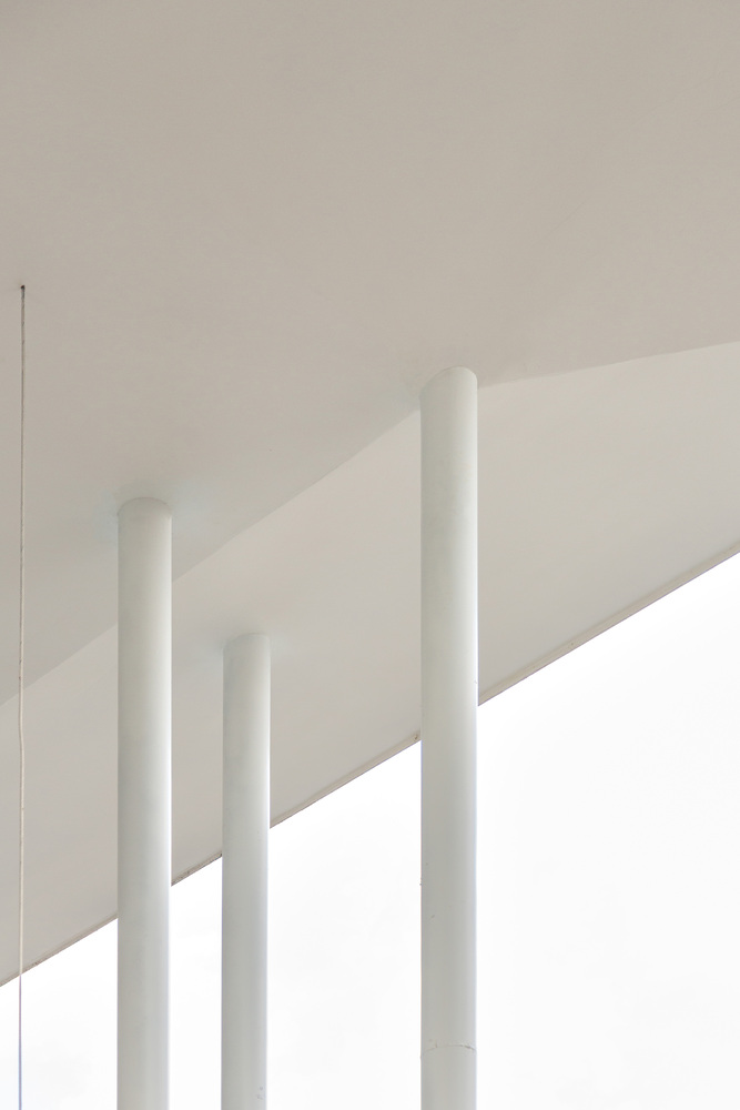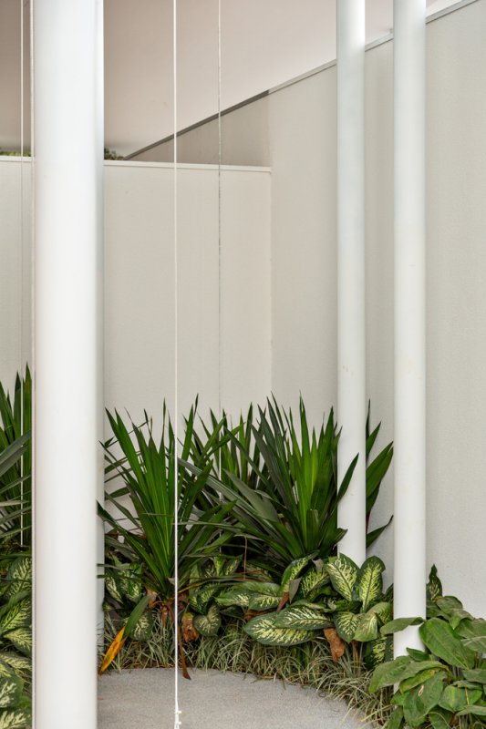 Эта система из тонких колонн и натяжных элементов служит не только опорой, но и пространственной матрицей, задающей организованный, но лёгкий характер павильону.